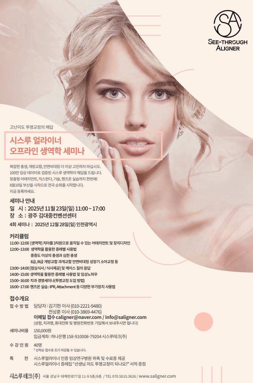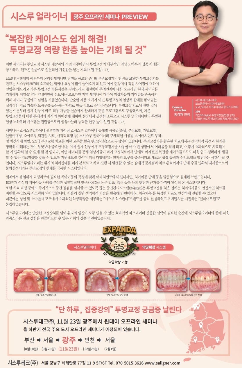 새소식 하반기 오프라인 세미나 안내드립니다. [공지] 하반기 오프라인 세미나 안내드립니다. 작성자테스트입니다. 작성일2025-08-20 목록으로 등록된 댓글이 없습니다. 이전글시스루얼라이너 키즈 구강확장 장치 [익스판다] 출시!
